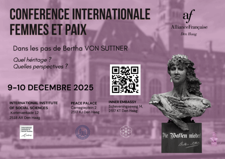 Les 9 et 10 décembre 2025 aura lieu la conférence internationale femmes et paix “Dans les pas de Bertha Von Suttner: Quel héritage ? Quelles perspectives ?”. Organisée par l’Alliance française des Pays-Bas et l’Institut international des sciences sociales, cette conférence se tiendra à l’Institut international des sciences sociales de La Haye (Pays-Bas).