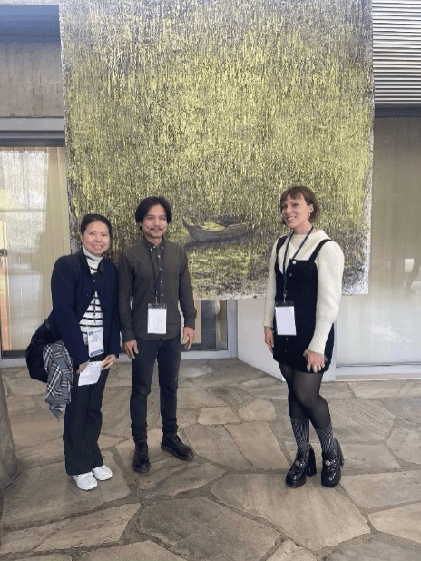 Photo de Samphoas Huy et Clara Etchenique en présence du peintre Nov_cheanick pendant le vernissage de l’exposition Cambodge, le Temps de la Mémoire. Le 09/12/2025