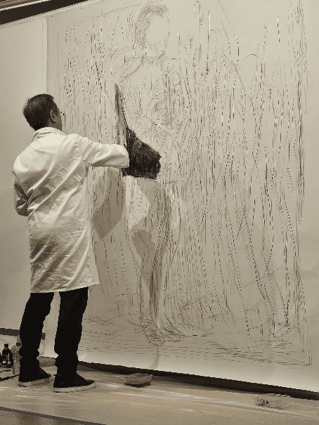Photo de l’artiste franco-cambodgien Séra à l’œuvre pendant le vernissage de l’exposition Cambodge, le Temps de la Mémoire. Le 09/12/2025